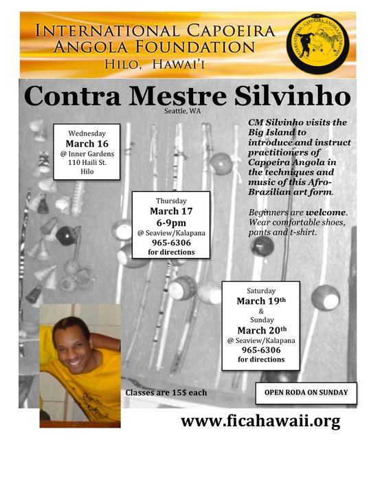 Mestre Silvinho is visitng from Seattle and will be leading classes in the movements, music, and traditions of Capoeira Angola over the September 13-14 weekend in Pahoa, HI. Beginners as well as experienced capoeiraistas from any and all backgrounds are welcome and invited to attend.